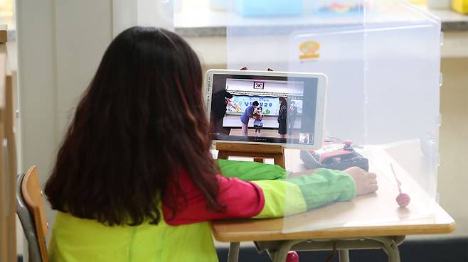 스승의 날인 15일 대구 달성군 논공읍 남동초등학교에서 돌봄교실에 나온 한 학생이 온라인으로 진행된 스승의날 행사를 보고 있다.