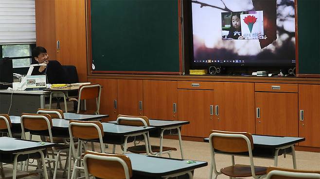 스승의 날인 15일 오전 서울 동작구 보라매초등학교 박민영 6학년 1반 담임선생님이 온라인 원격수업을 하고 있다.