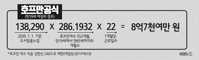 일단 호프만 공식은 간단히 말해, 사망 시점부터 정년인 (65살)까지 기대 수입을 계산하는 방식입니다. 예를 들어 만 19살 여성이 사망할 경우, 호프만 계산 결과는 다음과 같습니다.