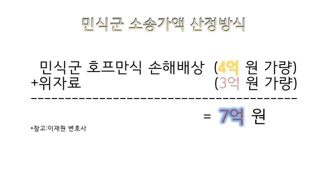 민식 군 부모는 지난해 11월 가해 운전자가 아닌 가해자의 보험사인 삼성화재를 상대로 소송을 제기했습니다. 그렇다면 민식 군 사고와 관련된 민사소송가액인 7억 원은 어떻게 산정됐을까요? "과도하다"는 입장에 맞서 일부 누리꾼들은 손해배상 계산 방식인 '호프만 공식'을 근거로 7살에 사망한 민식군의 장래 수입을 따졌을 때 적정수준이라고 맞서고 있습니다. 일부 누리꾼은 자체 계산 결과, 민식군의 경우, 7억 원을 훨씬 웃돈다는 의견을 내놓기도 했습니다.