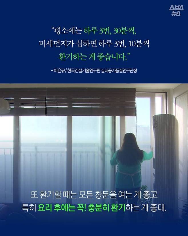 바로 '환기'를 하지 않으면 실내 공기질이 외부 공기질보다 훨씬 안 좋아질 수 있기 때문입니다.