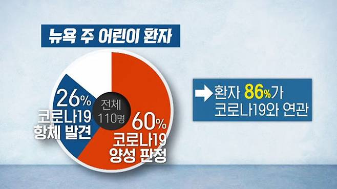 뉴욕주 어린이 환자 110명 가운데 60%가 코로나19 확진 판정을 받았고, 26%는 확진 판정을 받지는 않았지만 코로나19 항체가 발견됐기 때문입니다.
