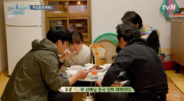 저녁을 먹으면서도 이들의 농담은 밥상을 채워주는 또 다른 반찬이 된다. 무 조림에 뭇국을 내놓은 차승눠에게 유해진이 "무에서 유를 만들어내네?"하고 아재개그를 던지자, 차승원은 "몸에 해로운 청바지가 뭔 줄 아냐"며 "유해진"이라고 한다. 그러자 다시 유해진 얼토당토 않은 아재개그를 던진다. "없는데 효성이 지극한 진이 뭐냐"며 "공효진"이라고.