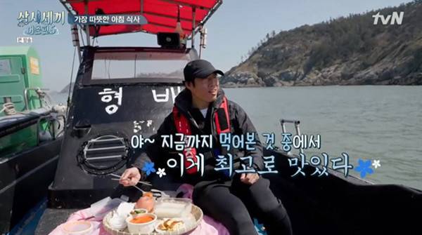 마음 한 구석의 부채감 때문일까. 다음 날 일찍 바다로 낚시를 나간 유해진은 아침 식사도 거른 채 낚시를 하겠다고 하고, 그러자 차승원은 굳이 밥과 반찬을 챙겨 배로 보내준다. 감동한 유해진은 밥을 다 먹고 사과에 '고마워'라고 새겨 찍은 사진을 전송해주고, 그걸 본 차승원은 무심한 듯 손가락 하트를 찍어 답장을 보낸다.