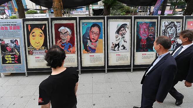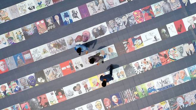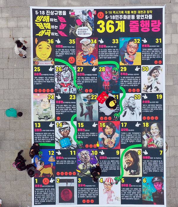 광주 동구 상무관 앞에 전두환 전 대통령과 5·18을 폄훼하는 이들을 풍자하는 그림이 깔려 시민들이 밟으며 지나고 있다. 상무관은 1980년 5·18 당시 희생자 시신을 임시 안치하던 장소였다.