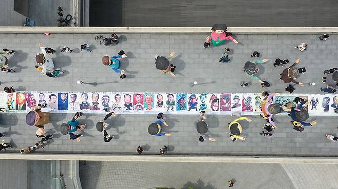 5·18 40주년 기념일을 이틀 앞둔 16일 오후 광주 동구 금남로 거리에서 오월시민행진이 펼쳐져 시민들이 5·18 희생자의 모습을 인형으로 제작해 행진하고 있다.
