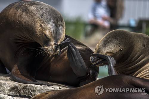epa08426010 South American sea lions in their enclosure at the Tiergarten Schoenbrunn zoo in Vienna, Austria, 16 May 2020. The Tiergarten Schoenbrunn zoo, with an area of 17,000 square meters, is part of the Schoenbrunn Palace Gardens and the UNESCO World Heritage Site Schoenbrunn. The oldest zoo in the world is one of the top tourists attractions, with more than two million visitors yearly. Loosening coronavirus restrictive measures allows the Schoenbrunn zoo, museums, restaurants, bars and cafes to reopen. EPA/CHRISTIAN BRUNA