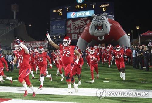 FILE - In this Nov. 23, 2019, file photo, Fresno State offensive lineman Dontae Bull, #72, heads into the stadium on senior night as they take on Nevada during the NCAA college football game in Fresno, Calif. This season, 39 major college football schools have scheduled 49 so-called buy games worth an estimated $65 million. If coronavirus disruptions cause Power Five teams to play more or only conference games, stretched athletic budgets could face huge holes. (AP Photo/Gary Kazanjian, File)