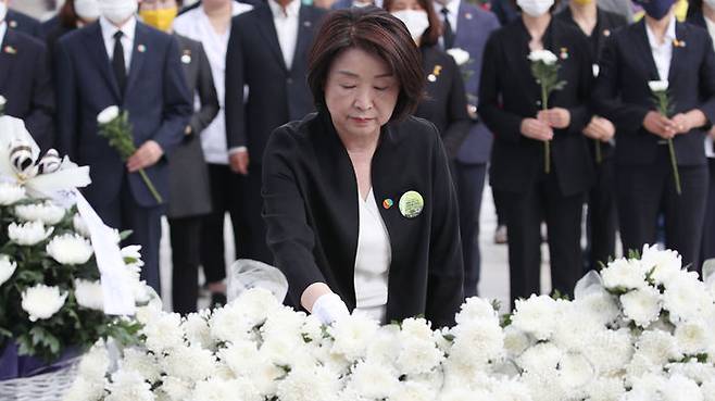 정의당 심상정 대표가 18일 오후 광주 북구 국립5ㆍ18민주묘지에 헌화하고 있다.