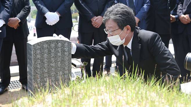 5·18민주화운동 40주년을 하루 앞둔 17일 오전 광주 북구 국립 5·18민주묘지에서 미래통합당 유승민 의원이 희생자 묘지를 참배하고 있다.
