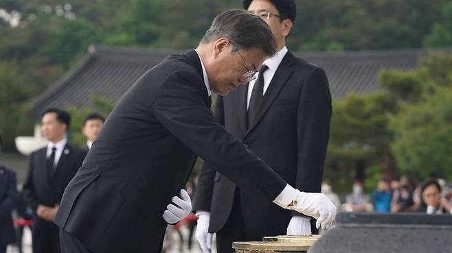 문재인 대통령과 부인 김정숙 여사가 제40주년 5·18 민주화운동 기념일인 18일 광주 북구 5·18 민주묘지 추모탑에 분향하고 있다.