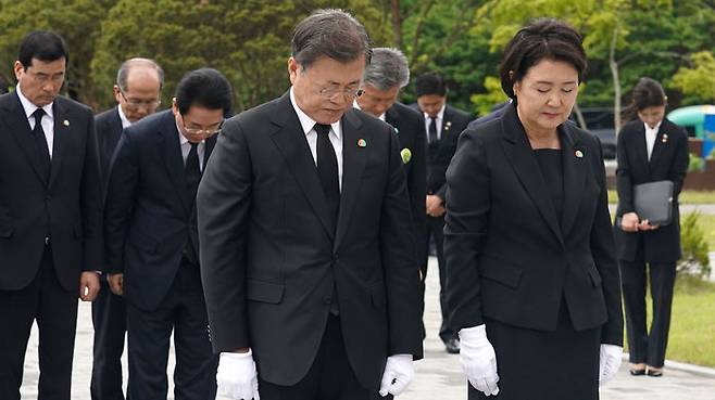 문재인 대통령과 부인 김정숙 여사가 제40주년 5·18 민주화운동 기념일인 18일 광주 북구 5·18 민주묘지 제2묘역에 분향한 후 묵념하고 있다.