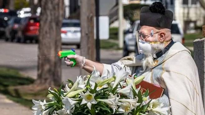 지난달 11일 미국 미시간주에 있는 성 암브로스 성당 앞에서 촬영된 사진입니다. 마스크와 투명한 얼굴 가리개를 쓰고 비닐장갑까지 착용한 신부가 한 손에는 성경책을, 또 다른 한 손에는 물총을 들고 있습니다.
