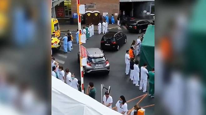 병원 입구부터 양쪽 길가에 서 있던 의사와 간호사들은 총리의 차량이 서서히 들어오자 차량 진행에 맞춰서 한 사람 한 사람 등을 보이며 돌아서는 모습을 연출했는데요, 윌메스 총리의 코로나19 대응에 대한 분노와 항의의 표시였습니다.