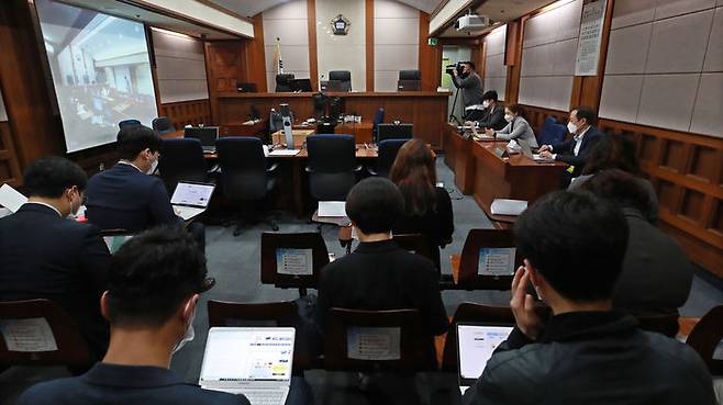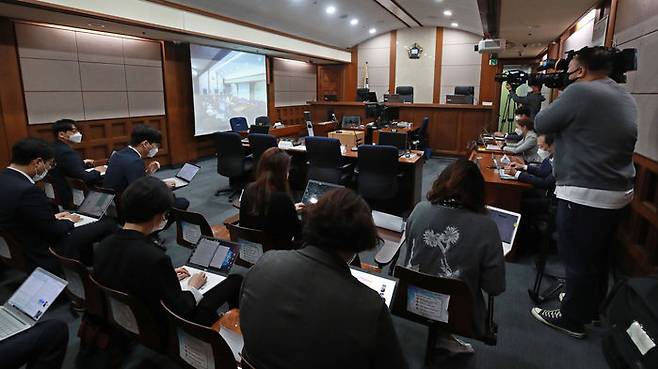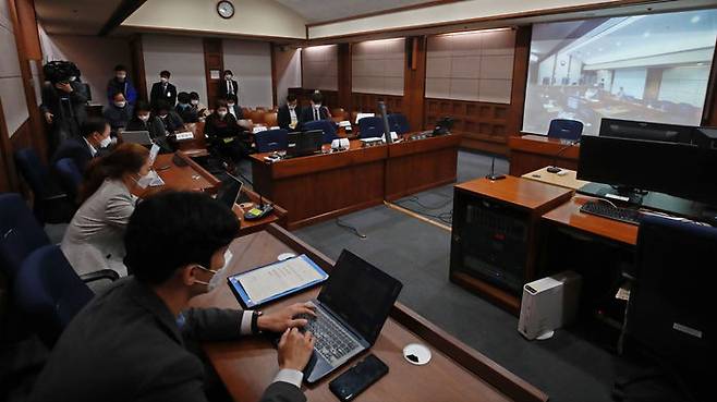 19일 오전 서울 서초동 서울고등법원에서 세계 최대의 아동 성 착취물 사이트 '웰컴 투 비디오' 운영자 손정우 씨의 범죄인 인도심사 심문이 열렸다. 중계 법정 안에서 취재진이 재판 시작을 기다리고 있다.