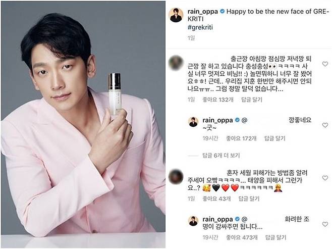 어제(18일) 비의 인스타그램에는 "혼자 세월 피해 가는 방법 좀 알려주세요 태양을 피해서 그런가요?"라는 팬의 댓글이 달렸습니다. 이에 비가 "화려한 조명이 감싸주면 됩니다"라며 유쾌한 댓글로 받아쳤습니다.