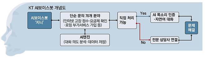 예컨대 KT 콜센터에 전화하면 AI보이스봇 '지니'가 "무엇을 도와드릴까요"라고 묻는다. 고객이 "로밍 부가서비스에 가입하고 싶다"는 등 문의를 시작하면 AI엔진이 대화 내용과 의도를 분석해 지니가 처리할 수 있는 업무인지 파악한다. 보이스봇이 처리 가능한 업무로 확인되면 지니가 "제가 도와드리겠습니다"라며 고객과 대화하면서 문제를 해결한다. 만약 보이스봇에 주어진 상담 분야가 아니면 사람인 '전문 상담사'가 투입된다. 또 고객이 생년월일과 주소를 말하지 않아도 딥러닝 기반 AI가 상담 중 음성만으로 최단 5초면 본인 여부를 확인한다.