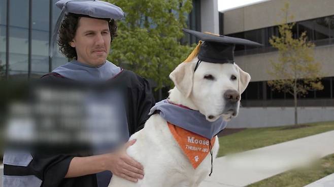 버지니아 공대 수의대에서 생활하고 있는 무스라는 치료견이 현지 시간으로 지난 15일 열린 졸업식에서 수의학 명예박사 학위를 받았습니다.