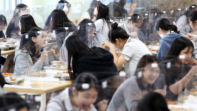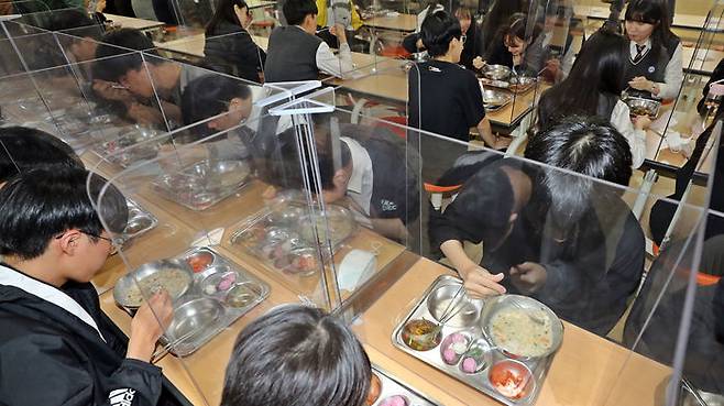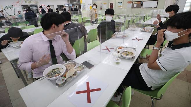20일 오후 청주시 흥덕구 봉명고등학교 급식실에서 학생들이 칸막이가 설치된 식탁에서 밥을 먹고 있다.