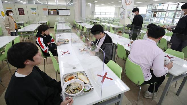 28일 오전 대전시 유성구 원신흥동 도안고등학교 급식실에서 고3 학생들이 점심을 먹고 있다. 학생들은 이날 코로나19 여파로 등교 개학이 미뤄진 지 80일 만에 다시 학교에서 수업을 받았다.