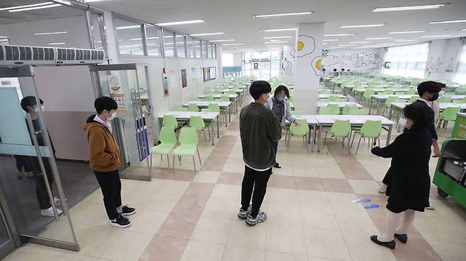 고등학교 3학년 학생들의 등교 개학이 시작된 20일 오후 서울의 한 고등학교 급식실에서 학생들이 거리를 두며 대기하고 있다.