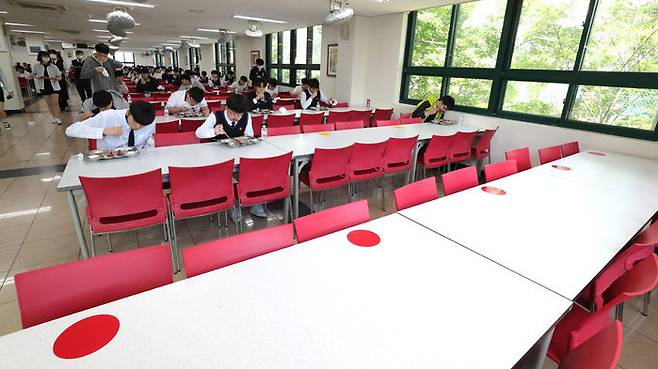 고등학교 3학년 학생들의 등교 개학이 시작된 20일 오후 서울의 한 고등학교 급식실에서 학생들이 거리를 두고 앉아 점심을 먹고 있다.