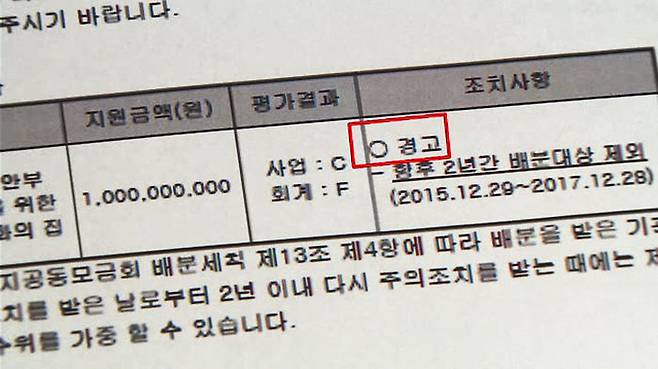 사회복지공동모금회가 지난 2015년 12월 정신대문제대책협의회에 보낸 제재 조치 통보 공문입니다.