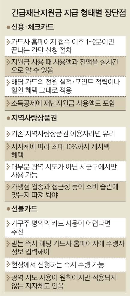 지역사랑상품권과 선불카드는 사용처를 헷갈릴 염려가 없고, 잘못 결제하더라도 지원금 대신 자신의 돈이 결제될 일도 없다. 온라인 신청이 어렵거나 가구주의 카드를 사용하기 어려운 상황이라면 선불카드나 상품권을 사용하는 게 나을 수 있다. 전국 읍면동 주민센터에서 신청할 수 있다. 온라인으로 신청하면 지급 준비 완료 문자를 받은 뒤 새마을금고 등 지정된 장소에서 받으면 된다.