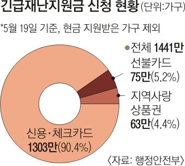 지난 19일 기준 재난지원금을 신청한 전국 1441만 가구(현금 지원 가구 제외) 중 신용·체크카드 형태로 지원금을 받은 가구는 전체의 90.4%(1303만 가구)에 이른다. 기존에 소지하고 있거나 새로 발급한 신용·체크카드에 지원금을 포인트 형태로 받는 방식이다. 카드사 홈페이지 신청으로 모든 절차가 마무리되는 만큼 주민센터나 은행 창구를 방문하지 않아도 된다.