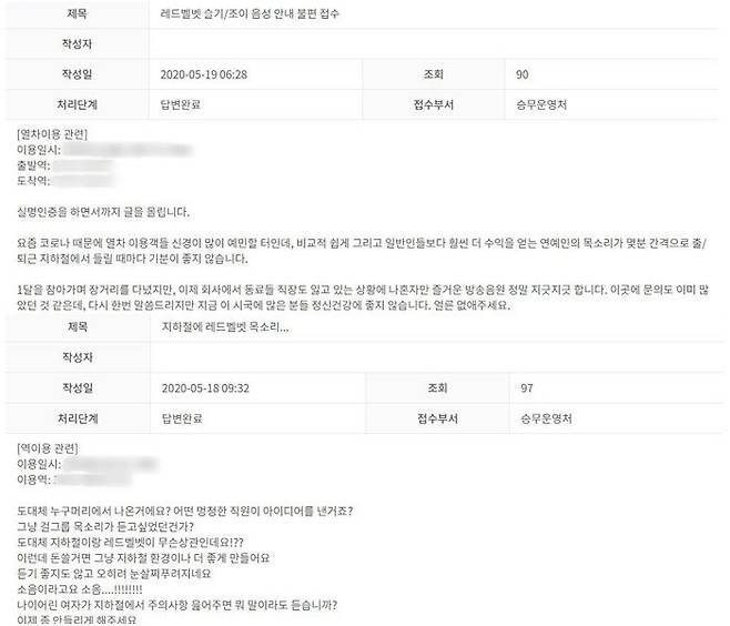 민원을 제기한 승객들은 "이런 데 돈 쓸 거면 지하철 환경이나 더 좋게 만들어라", "나 혼자만 즐거운 방송 음원 정말 지긋지긋하다" 등의 이유를 들며 안내방송을 없애달라고 요청했습니다.