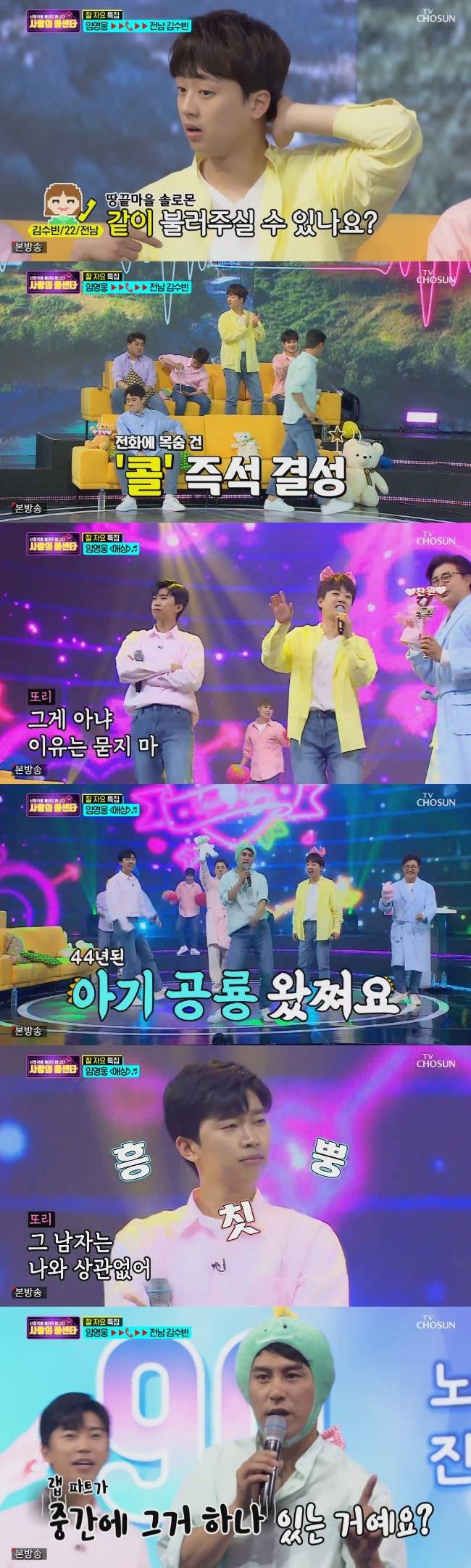 이에 임영웅은 이재훈, 장민호는 김성수, 이찬원은 유리 역할을 맡아 즉석에서 ‘콜’을 결성해 노래를 불렀다. 임영웅과 이찬원의 상큼 발랄한 안무와 함께 깜찍한 탈을 쓴 장민호의 랩이 어우러져 신선한 무대를 완성했다. (사진=TV조선 '신청곡을 불러드립니다-사랑의 콜센타' 방송 캡처)