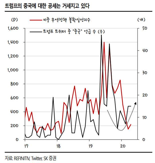 미국과 중국의 무역전쟁 재개 여부는 하반기 최대 리스크 요소로 꼽힌다. 오는 11월 대선과 맞물려 트럼프는 중국에 대한 공세를 높일 것으로 전망되기도 한다. 한 연구원은 “양국 모두 전면전이 부담스럽고 서로에게 불리하다”면서 “지난 대선에서 팜벨트 지역의 승리로 당선된 트럼프는 무역전쟁으로 인해 중국의 미국의 농산물 수입이 급감한 점이 부담스럽고, 중국은 샤오캉(小康, 모든 국민이 편안하고 풍족한 생활을 누림)사회 목표달성이 힘들어진 상황에서 경기부양이 반드시 이뤄져야 한다”고 설명했다.