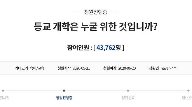 20일 청와대 국민청원 게시판에 '등교 개학은 누굴 위한 것입니까?'라는 제목의 청원 글이 올라왔습니다.