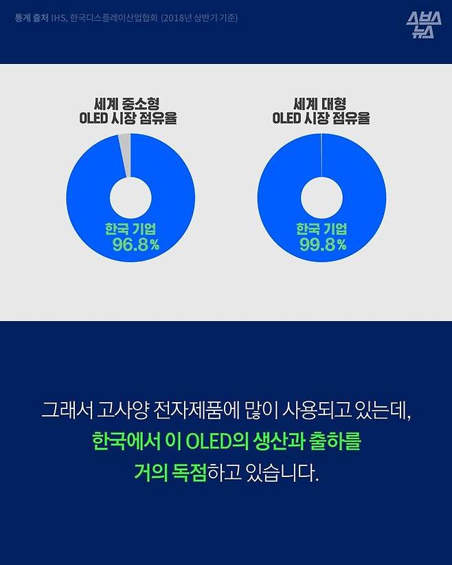 LCD를 대체할 차세대 디스플레이라고 불리는 OLED 패널의 생산과 출하를 세계에서 거의 독점하고 있기 때문이죠. 현재 일본에서도 OLED 자체 양산 기술을 개발하고 있지만, 대형 OLED 패널의 안정적인 생산은 어려워 한국업체의 도움이 필요한 상황입니다. 한국이 어떻게 세계 OLED 시장에서 선두에 설 수 있었는지, 스브스뉴스가 알아봤습니다.