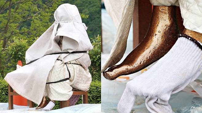 그런데 애초 삼일절로 예정된 소녀상 제막식이 코로나19 여파로 두 차례 연기되면서 문제가 생겼습니다. 관심에서 멀어진 소녀상을 아무도 제대로 관리하지 않은 겁니다. 소녀상은 헌 이불에 겹겹이 싸여 고무줄을 동여매진 상태였고, 이불 아래로 드러난 한쪽 발에는 작업용 면장갑이 씌워져 있었습니다. 공사 자재를 담았던 것으로 보이는 커다란 작업용 통도 옆에 그대로 남아 있었습니다.