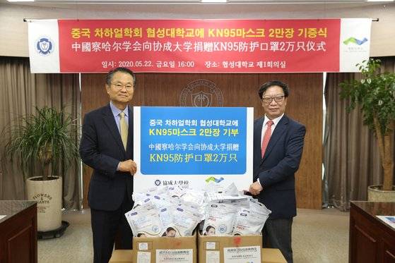지난 5월 22일(금) 협성대학교(총장 박명래)는 중국 차하얼학회로 부터 협성대학교에서 공부하고 있는 중국인 유학생 및 외국인 유학생들의 코로나19 극복 위한 방역용 마스크 2만장을 기증받았다고 밝혔다.