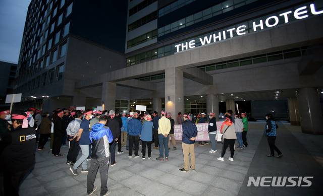 [평창=뉴시스]김경목 기자 = 강원 평창군 봉평면 주민들이 22일 오후 평창군 봉평면 '더화이트호텔' 앞에서 신종 코로나바이러스 감염증(코로나19) 확산 예방을 위한 단기체류 외국인들의 임시생활시설 지정에 반대하는 시위를 하고 있다. 120여명의 주민들은 앞서 세종시 정부세종청사 보건복지부 앞에서 집회를 갖고 더화이트호텔을 격리시설로 지정한 방침을 철회할 것을 요구했다. 2020.05.22.