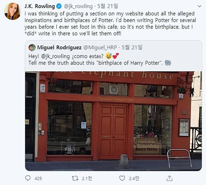 롤링은 이날 트위터로 팬들과 대화하는 와중 엘리펀트 카페가 해리포터의 탄생지가 맞느냐는 질문을 받자 "나는 엘리펀트 카페에 다니기 몇 년 전부터 해리포터를 쓰고 있었다"면서 "그곳에서 해리포터를 쓰긴 했지만, 탄생지는 아니다"라고 답했습니다.