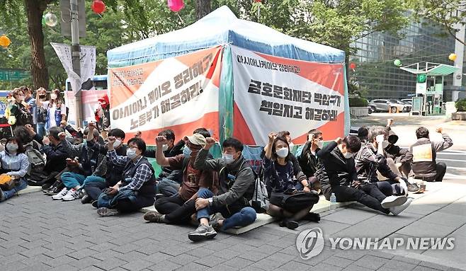 (서울=연합뉴스) 김인철 기자 = 26일 서울 종로구 금호아시아나 본사 앞에서 아사아나KO 노조원들이 종로구청의 농성장 행정대집행에 대비해 자리에 앉아 구호를 외치고 있다. 2020.5.26