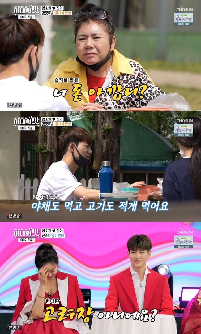 함소원은 직접 준비한 건강 도시락을 오픈했다. 도시락은 샐러드, 잡곡빵, 죽으로 가득 차 있었다. 마마는 불만족스러운 표정을 감추지 못했다. 함소원-진화 부부는 “건강을 위해 샐러드를 드셔야 한다”고 거듭 강조했다.
