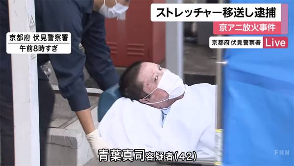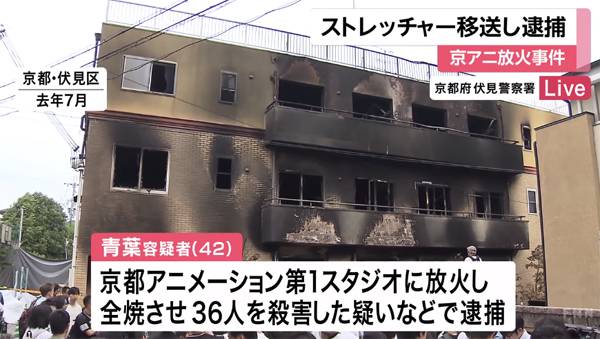 27일 아사히 등 일본 언론들은 "교토 애니메이션 제1스튜디오 방화로 36명을 사망시킨 용의자 아오바 신지를 경찰이 체포했다"고 보도했다.