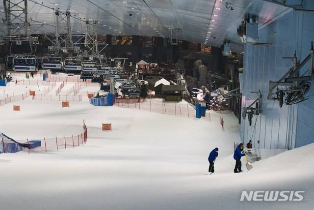 [두바이=AP/뉴시스]27일(현지시간) 아랍에미리트(UAE) 두바이 몰 실내 스키장에서 '스키 두바이' 직원들이 눈을 다지고 있다. 두바이는 신종 코로나바이러스 감염증(코로나19) 확산 예방을 위한 경제 활동 규제를 이날부터 대부분 완화해 영화관, 테마공원, 체육관 등이 영업 재개에 들어갔다. UAE의 코로나19 누적 확진자 수는 3만1969명이고 사망자는 255명으로 집계됐다. 2020.05.28.