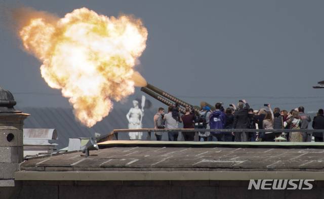 [상트페테르부르크=AP/뉴시스]러시아 상트페테르부르크 도시 건립 317주년을 맞아 27일(현지시간) 상트페테르부르크에서 축포를 쏘는 대포 주변에 사람들이 모여 있다. 수 세기 동안 이어진 전통 축포 발사에 올해는 신종 코로나바이러스 감염증(코로나19)과 싸우는 의료진이 축포를 쏜 것으로 알려졌다. 2020.05.28.