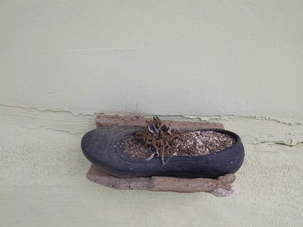 거창한 조형물은 결코 아니다. 버려진 검정고무신에 야생화를 심어 놓아 상상의 나래를 펼치게 하는 수준의 작품이다.