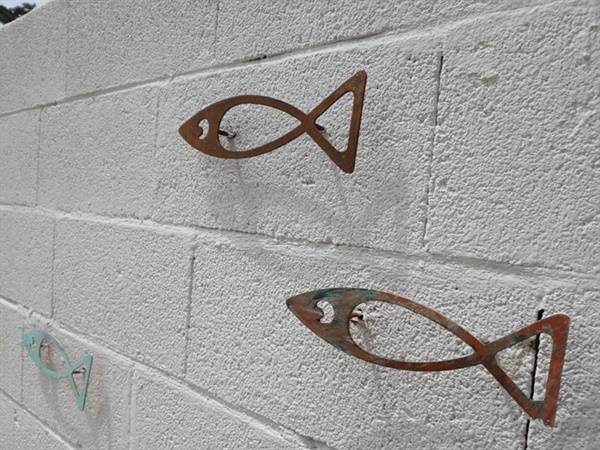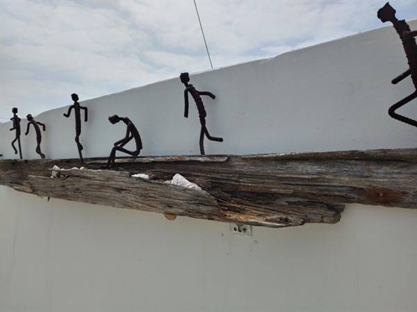 또 기왓장이나 장어통발로 만든 화분도 그 기발한 상상력이 인상적이다. 바다에 있어야 할 노를 벽에 부착해 놓고 그 위에 조개 등으로 꾸며 놓았다. 또 철사를 구부려 만든 생선은 하늘로 치솟고 있었다.