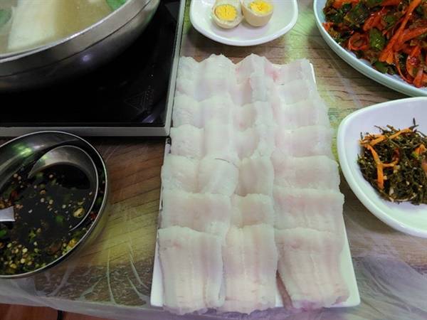 | ▲ 여름철 별미인 갯장어 샤부샤부의 맛을 좌우하는 것은 가시처리다. 얼마만큼 칼집을 넣어 가시를 부드랍게 하느냐의 여부다. 이 집의 가시 처리는 휼륭했다. 갯장어의 풍미를 최대한 끌어 올리게끔 잘 처리가 되어 있었다. |