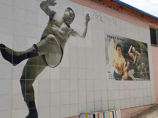 안내판을 벗어나 조금 걸어 들어가니 고흥 출신의 박치기왕 김일의 역동적인 모습이 타일에 새겨진 게 인상적이다. 마찬가지로 고흥 출신인 영화 <반칙왕>의 주인공 백종호와 프로레슬러 노지심의 모습도 함께하고 있다.