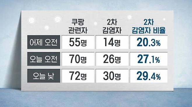 어제 확진자 가운데 2차 감염된 사례가 20% 정도였는데, 오늘 낮 기준으로는 전체 확진자의 30% 정도로 늘었습니다.