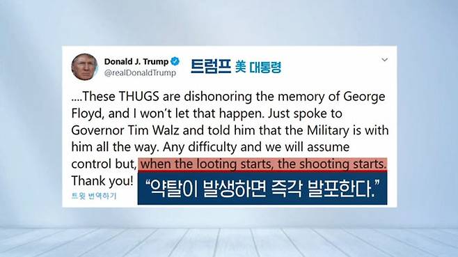 트럼프 대통령은 미니애폴리스 소요 사태와 관련해 "약탈이 발생하면 즉각 발포한다"는 트윗을 올렸는데, 트위터 측은 이 글이 시민에 대한 협박이라면서 또 한 번 '주의' 딱지를 붙였지만 "공익을 위해 삭제하지는 않기로 했다"고 밝혔습니다.