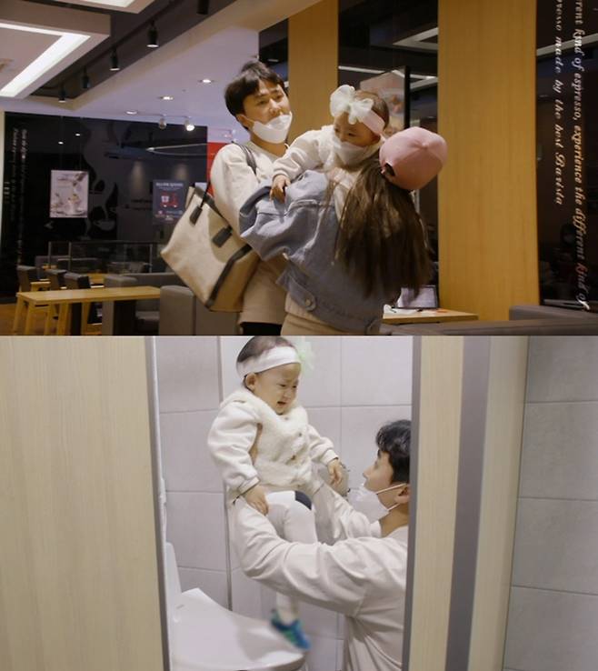 하지만 김우혁의 위기는 여기서 끝나지 않았다. 외출 도중 딸 로아의 기저귀를 갈게 된 김우혁은 남자 화장실을 찾았다. 하지만 기저귀 교환대가 없어 온몸이 땀으로 범벅된 채 기저귀를 갈아야 했다.